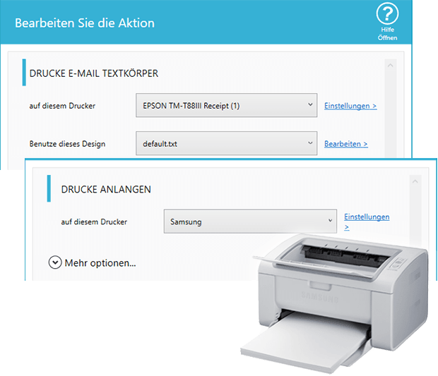 durchführt, beispielsweise das Drucken von E-Mails und/oder Anhängen (FAX, PDF, Word, Excel, Fotos, TIFF,...), das Löschen,