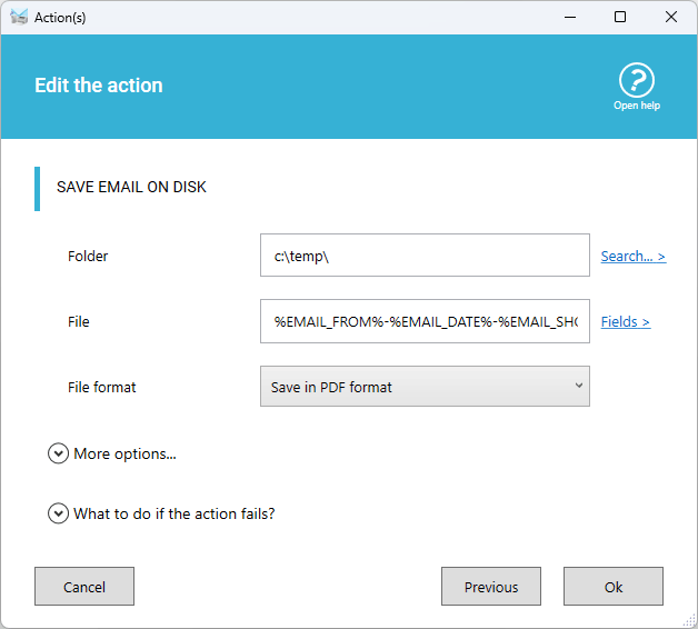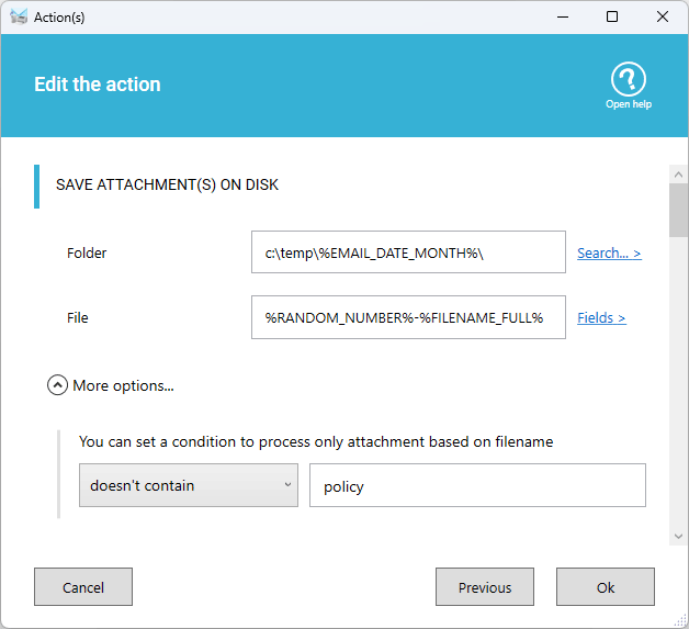 - Select the folder and filename; Include variables like email address, subject, date, ...