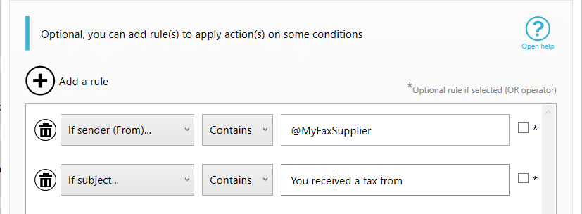 For archiving and backup purposes you often need to have your faxes saved on disk, it is easy with Automatic Email Manager, just after the print action you add a 'save attachment' action, specifiy the disk location,and that's it.
