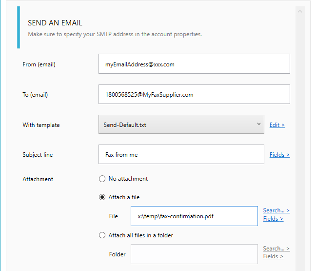 - Define the fax file attachment (PDF)